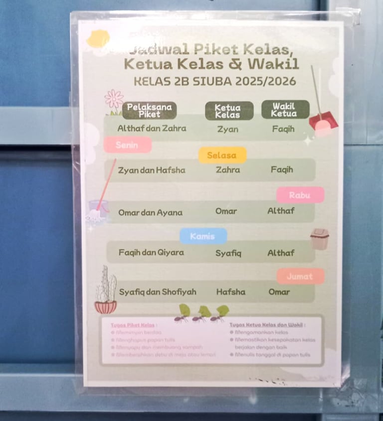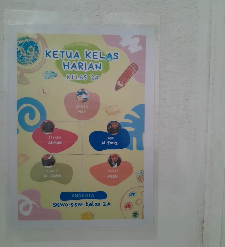 ruang kelas di atur rapi, tempat duduk berjajar rapi, tas di gantung rapi sehingga suasana belajar lebih tertib