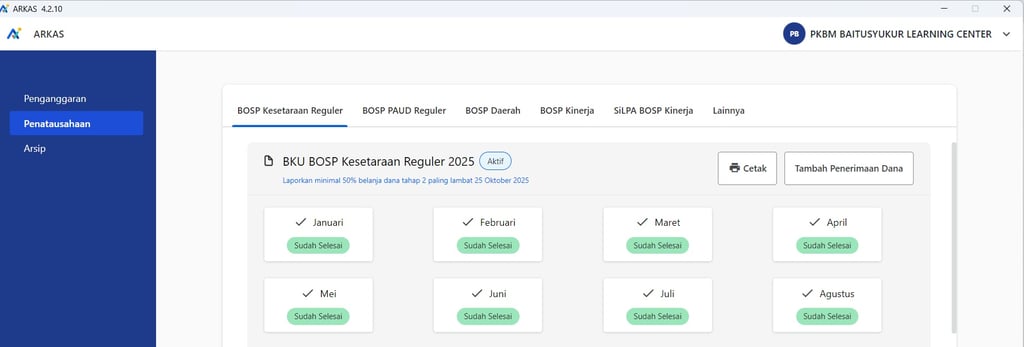 Pelaporan keuangan dilakukan secara berkala dan terbuka melalui laporan SPJ bulanan, rapat koordinasi, serta pelaporan daring sesuai ketentuan Dinas Pendidikan (Pengisisan Aplikasi ARKAS). Setiap pengeluaran dilengkapi bukti transaksi dan dipertanggungjawabkan sesuai prosedur. Dengan sistem ini, pengelolaan keuangan di PKBM Baitusyukur terjaga transparansinya, mendukung akuntabilitas, serta memastikan dana digunakan tepat sasaran untuk mendukung keberlangsungan program pendidikan kesetaraan.