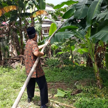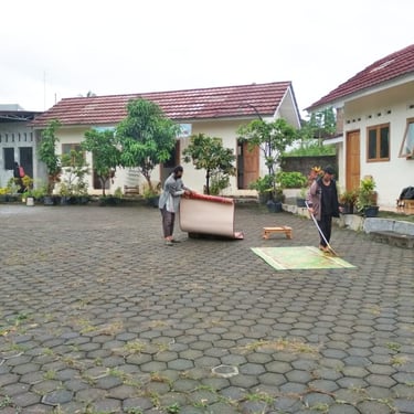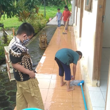 Kegiatan mencakup penyapuan area halaman, perapian taman, dan pemangkasan pohon di sekitar lingkungan pondok dan ruang belajar.