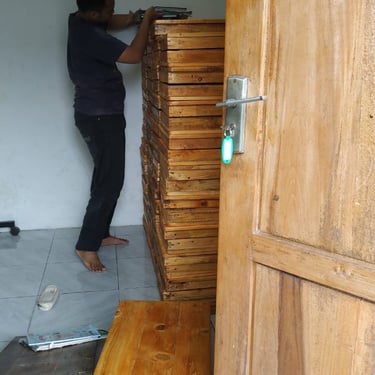 Dokumentasi menunjukkan kegiatan penataan ulang meja kayu hasil perawatan oleh tim sarpras.